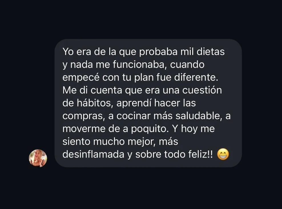 “Siempre empezaba dietas y las dejaba a los pocos días. Con este plan aprendí a comer bien, sin pasar hambre y disfrutando la comida. En dos semanas ya me sentía menos hinchada y con más energía. Lo que más me ayudó fue entender cómo organizarme con las comidas y las listas de súper.”